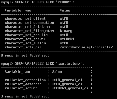 mysql> SHOW VARIABLES LIKE '%char%';